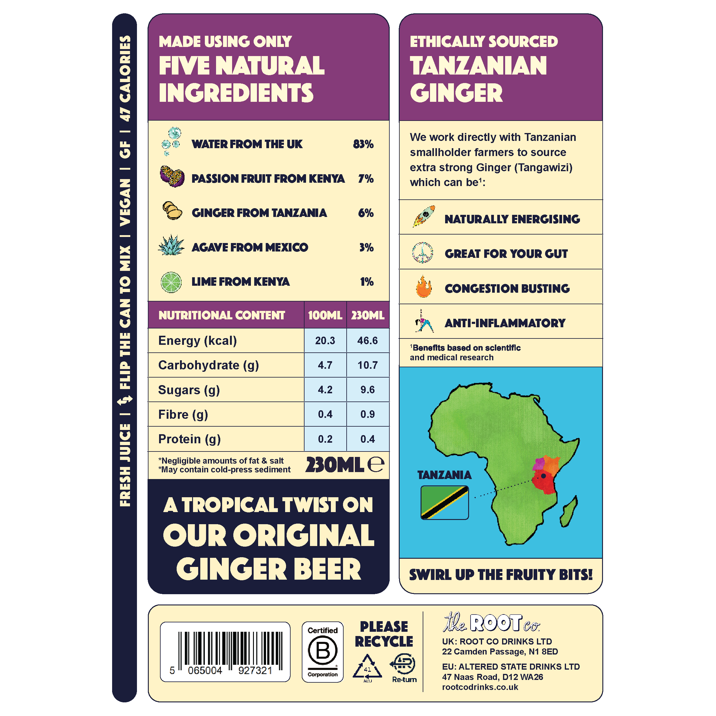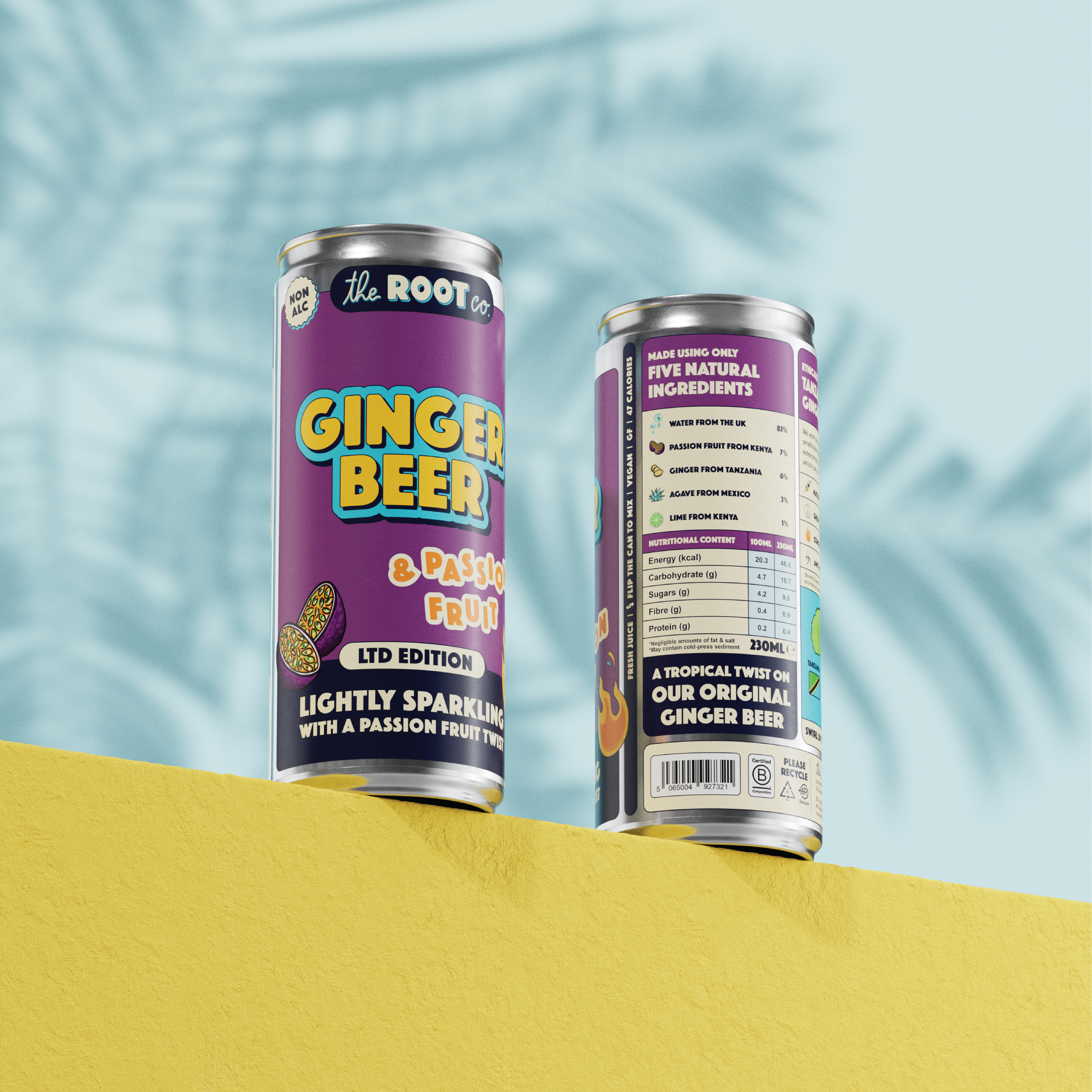 5 Ingredients: Cold-Pressed Ginger, Passion Fruit & Lime, Blended with Agave Syrup & Sparkling Water. |